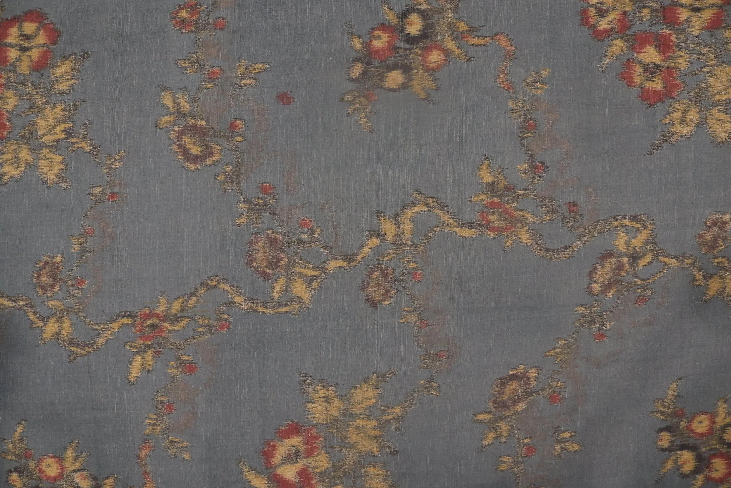 What began as a French Rococo floral, reborn through Indian imagination a century later, is here transformed again. Each thread of the warp is printed before weaving, so that the design drifts through the cloth like memory through light—sharp in places, dissolving in others. The meandering vine, once a polite parlor motif, now trembles with motion, its edges softened by breath and time. Woven linen lends a dry warmth, a sense of something long-loved and rediscovered.