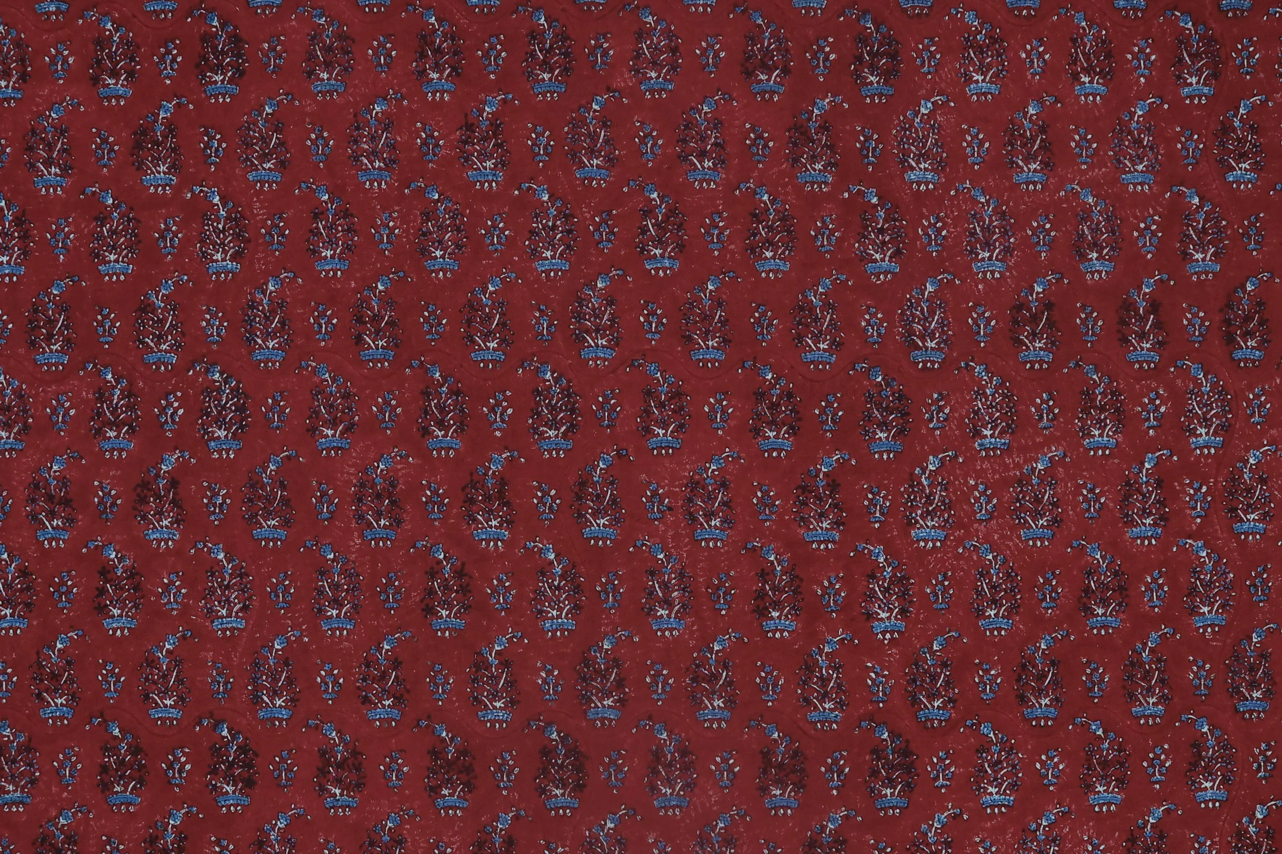 Three carved blocks—one for outline, one for body, one for bloom—work in rhythm to build the pattern of Crimson Buta: small trees flowering in vessels across a field of madder red. Each press leaves its own slight tremor, a fingerprint of the hand that made it. The pigments settle into the cotton as if they’ve always belonged there, and the softened finish gives the cloth a warmth that feels inherited rather than new.